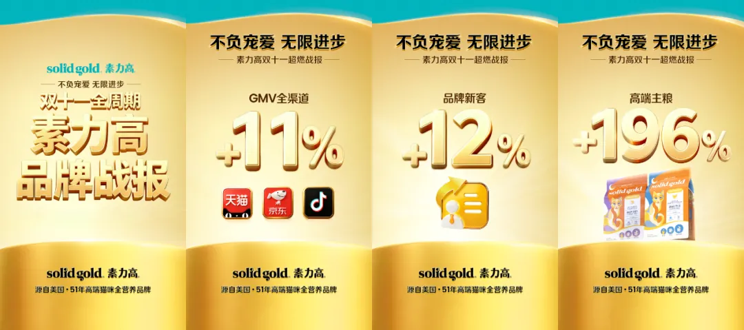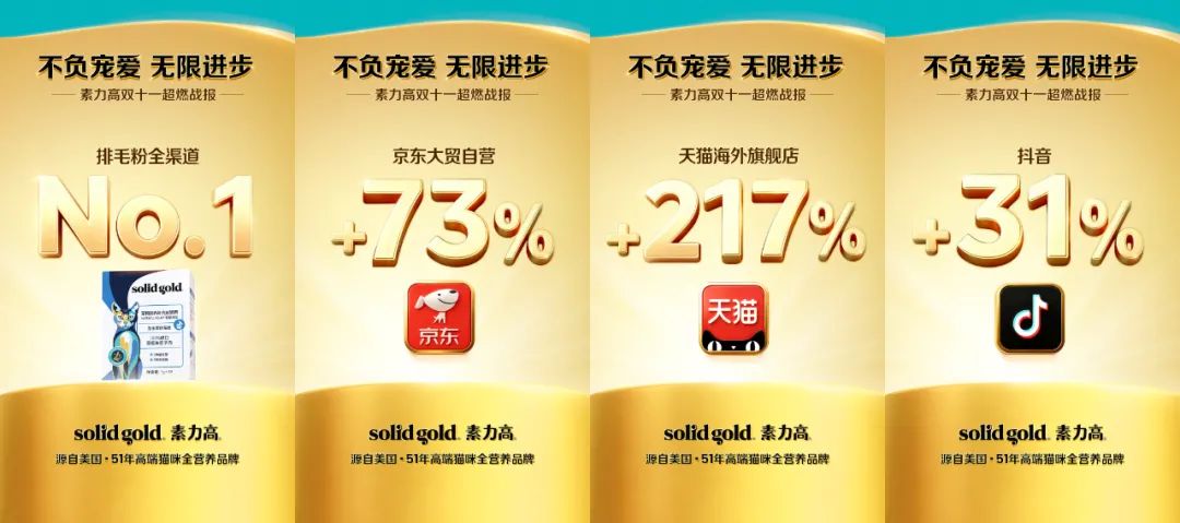 凭借创新产品实力与热点话题,在双十一购物节期间,SolidGold素力高电商GMV全渠道实现同比增长11%14,新客同比增长12%14。旗下高端主粮同比增长196%14,排毛粉更强势霸榜全渠道No.114。此外,京东大贸自营销售实现同比增长超73%14;天猫海外旗舰店销售同比增长217%14;抖音渠道销售同比增长31%14。