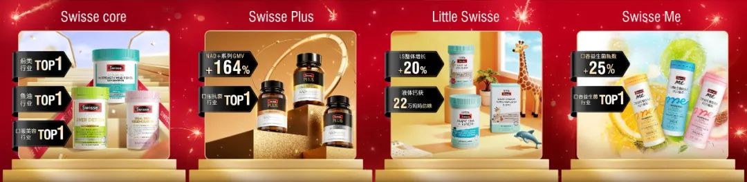 此外,Swisse斯维诗与Swisse PLUS、Little Swisse、Swisse Me组成的“Swisse MegaBrand”品牌战略矩阵精准把握消费细分需求,双十一期间全面爆发。其中,Swisse斯维诗稳占蓟类3、鱼油4、口服美容行业5销量No.1;SwissePLUS斩获口服抗衰行业销量No.16,NAD+系列GMV增长164%7;LittleSwisse整体增长20%8;SwisseMe口香益生菌行业实现销量No.19,再次展现高端营养领域的领先势能。